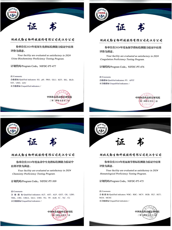 在血清中生化指標(biāo)(NIFDC-PT-509)、血液學(xué)指標(biāo)(NIFDC-PT-475)、血凝學(xué)指標(biāo)(NIFDC-PT-476)和尿生化指標(biāo)(NIFDC-PT-477)四個關(guān)鍵項目的能力驗證過程中,天勤生物武漢分公司提交了全部37個能力驗證指標(biāo),且所有項目均以滿分100分通過,最終獲得“滿意”的最高等級認(rèn)定。在臨床檢驗領(lǐng)域,天勤生物武漢公司不僅配備了先進的儀器設(shè)備,還建立了完善的實驗室質(zhì)量控制體系,并擁有一支高技能的專業(yè)團隊,這一系列優(yōu)異的成績充分展示了天勤生物武漢分公司在臨床檢驗領(lǐng)域的扎實功底。