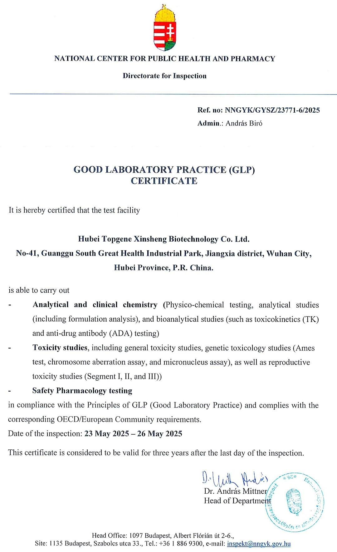 近日,湖北天勤鑫圣生物科技有限公司(以下簡(jiǎn)稱:“天勤鑫圣”)收到OECD成員國(guó)匈牙利國(guó)家公共衛(wèi)生和藥品中心(NNGYK)頒發(fā)的GLP證書,認(rèn)證內(nèi)容包括“分析和臨床化學(xué)(包括制劑分析、生物分析如TK,ADA等)”、“毒性試驗(yàn)(包括一般毒性、遺傳毒性和生殖毒性等)”和“安全藥理學(xué)試驗(yàn)”。