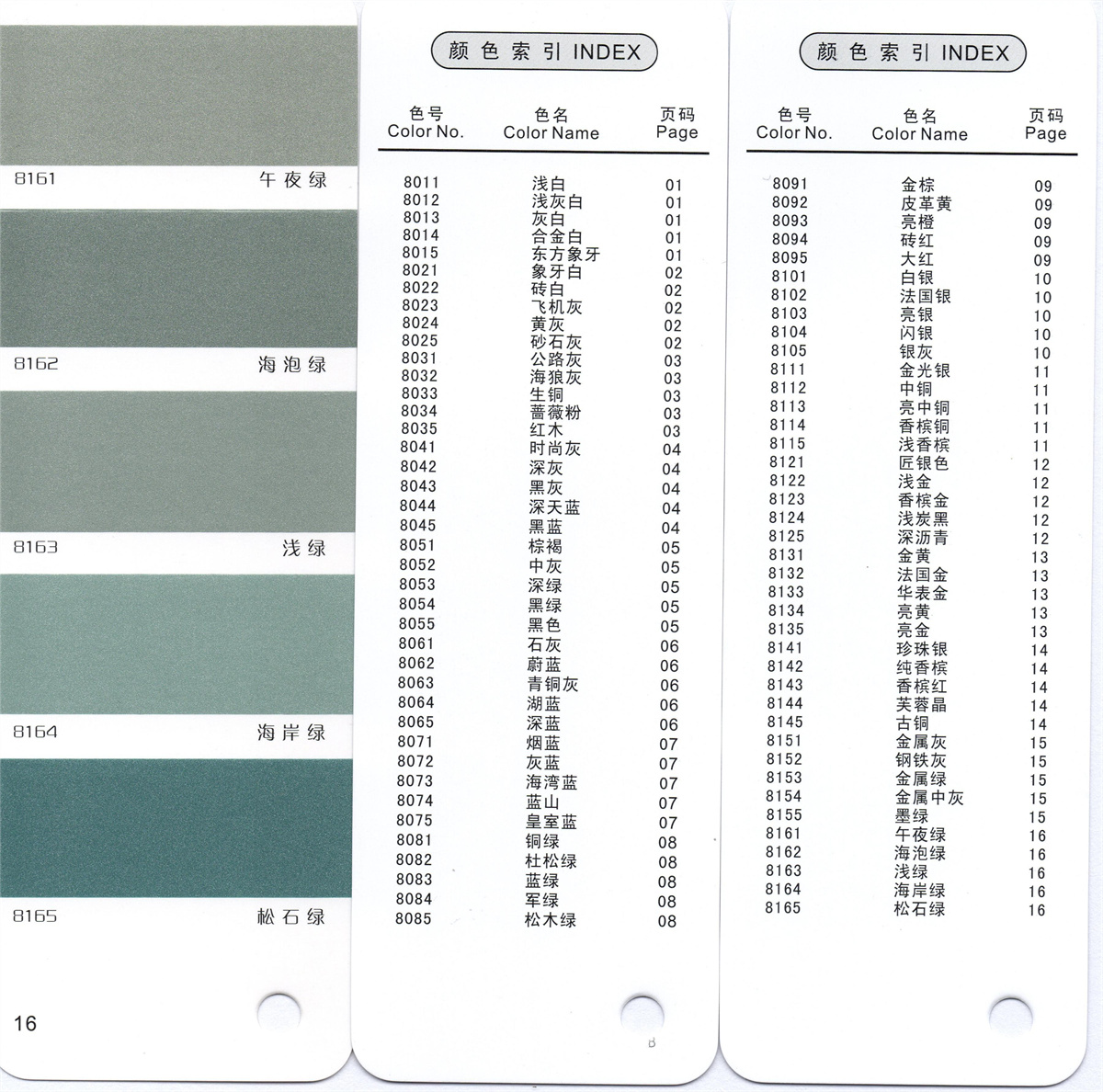 友情告知:以下氟碳漆顏色包含金屬質(zhì)感,由于圖片無法呈現(xiàn)實際效果,以及顯示器分辨率不同,此電子色卡只作為色系的參照物,具體顏色請咨詢?nèi)蛎赓M服務(wù)熱線:400-007-0957
