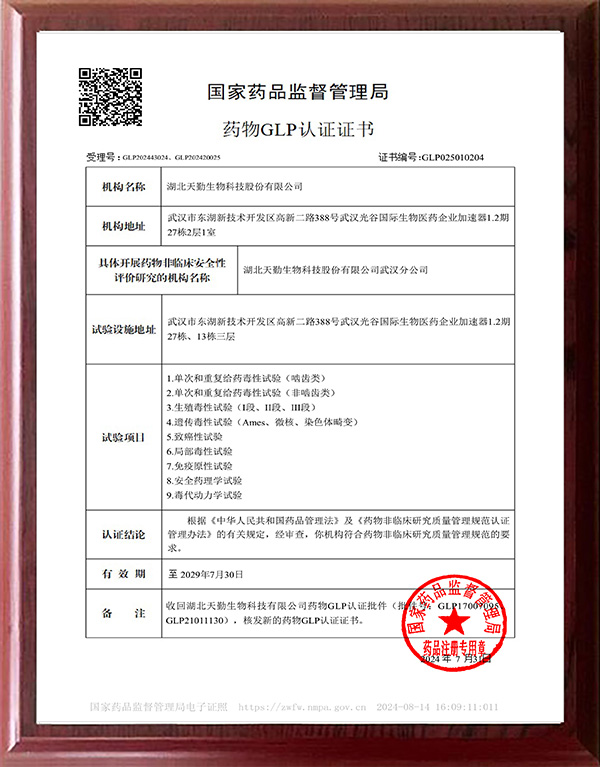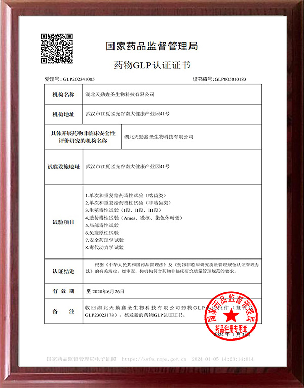 藥物GLP認(rèn)證批件